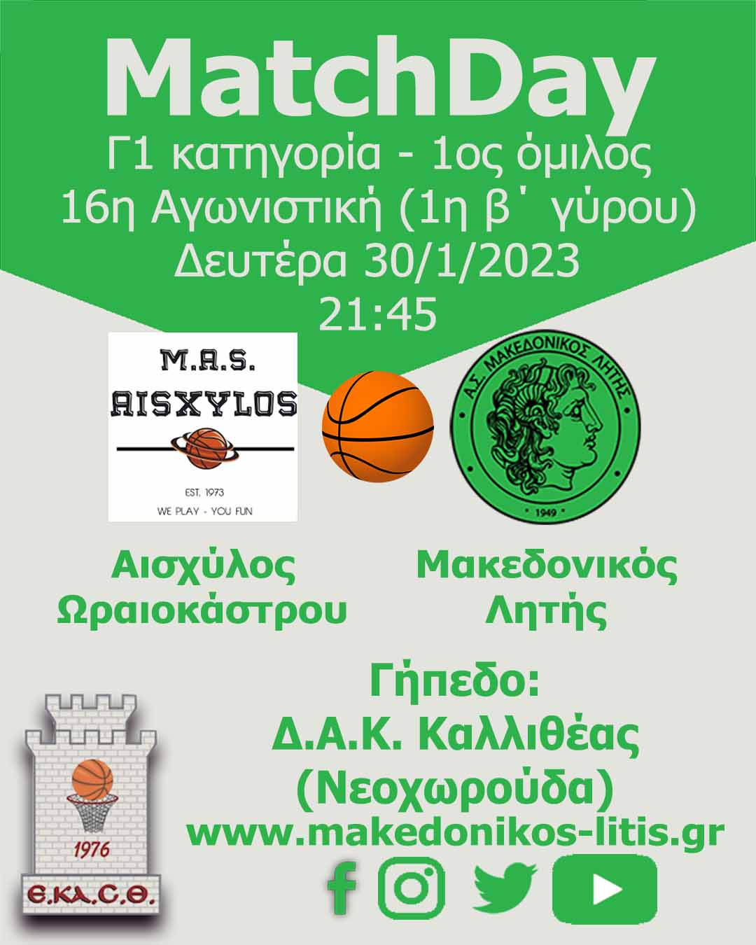 Αύριο 30/1 και ώρα 21:45 η ομάδα μας αντιμετωπίζει εκτός έδρας τον Αισχύλο Ωραιοκάστρου.