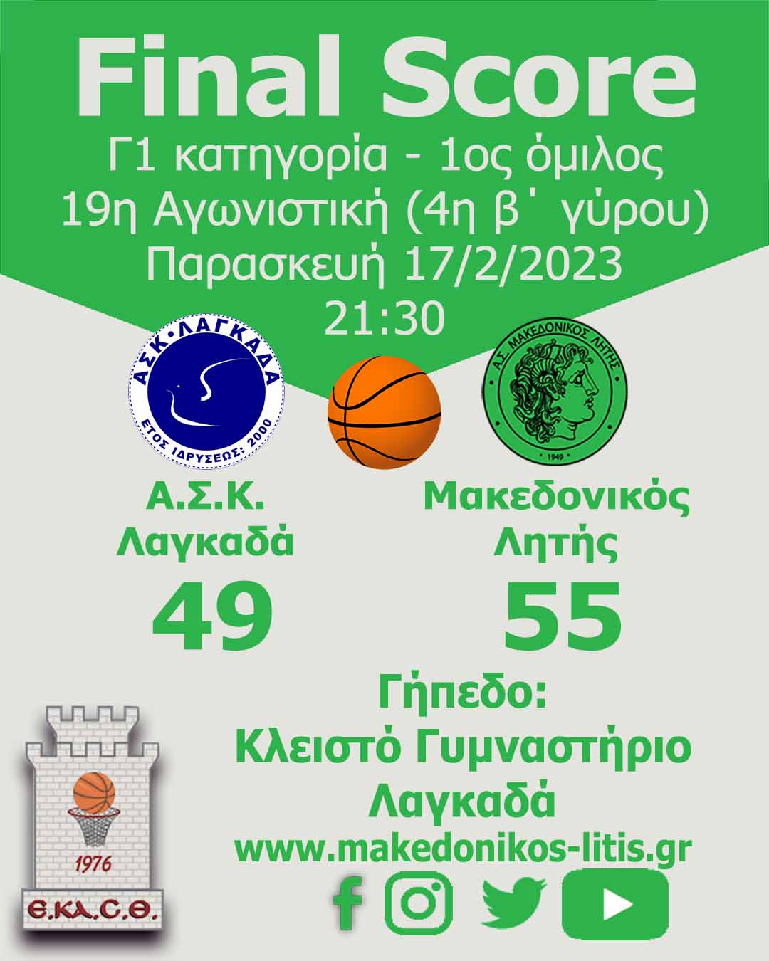 Σε έναν δυνατό αγώνα με στιγμές έντασης, ο Μακεδονικός Λητής πήρε το προβάδισμα στα μέσα του δεύτερου δεκάλεπτου και έφτασε στο +14 στο τέλος του τρίτου δεκάλεπτου. Στο τελευταίο δεκάλεπτο, άντεξε στην αντεπίθεση του ΑΣΚ Λαγκαδά και έφτασε στην νίκη.