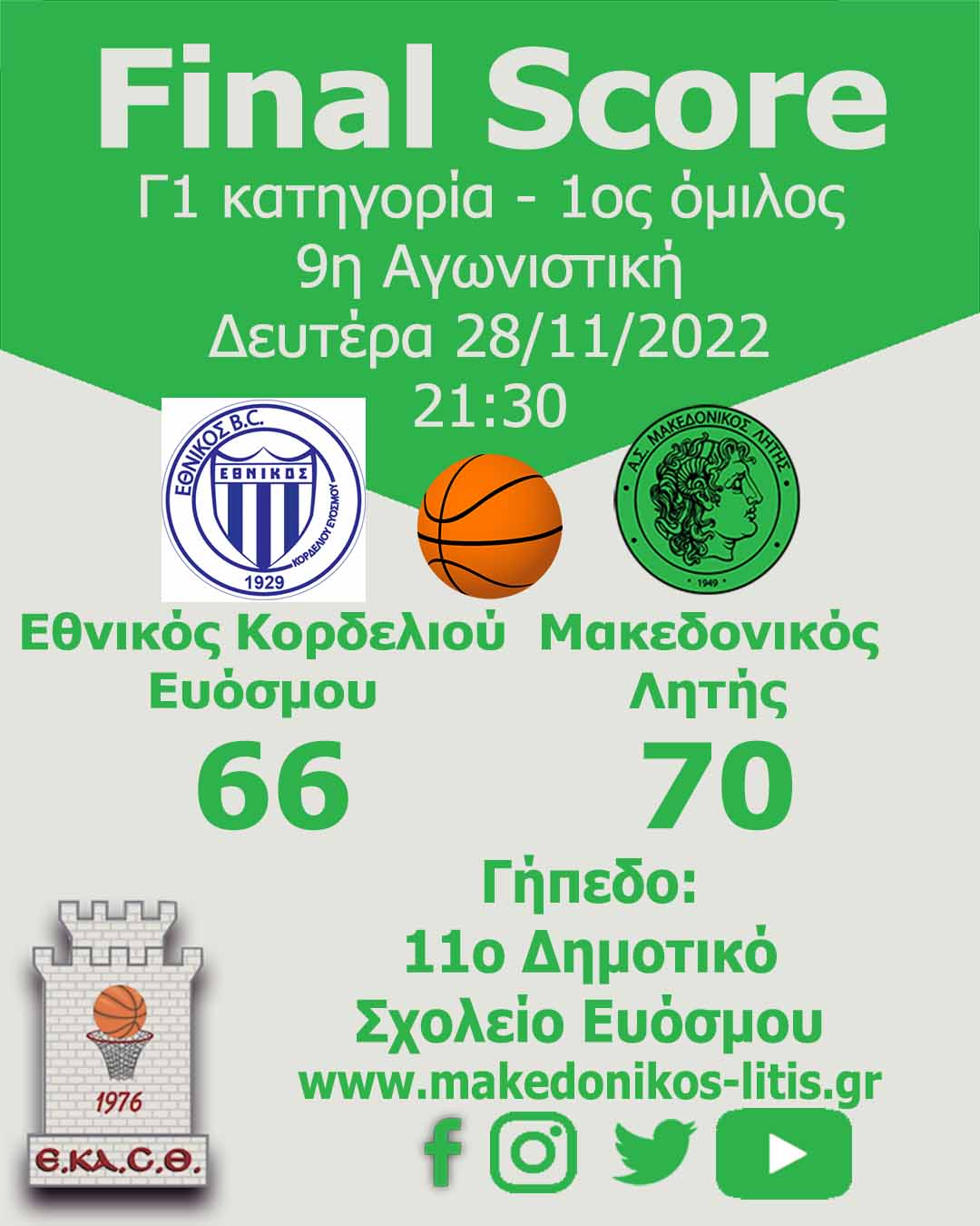 Εκτός έδρας νίκη για τον Μακεδονικό Λητής επί του Εθνικού Κορδελιού Ευόσμου με 70-66 στον αγώνα της Δευτέρας 28/11 για την 9η αγωνιστική του πρωταθλήματος.