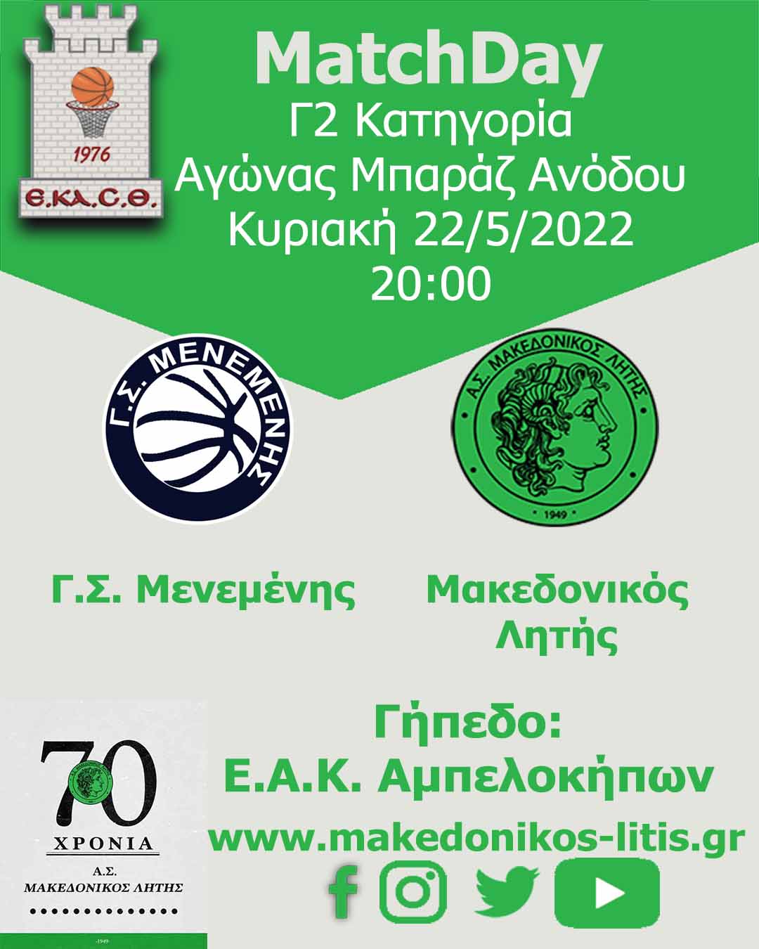 Δεύτερος αγώνας μπαράζ ανόδου σήμερα 22/5 και ώρα 20:00 και ο Γ.Σ. Μενεμένης φιλοξενεί την ομάδα μας στο Ε.Α.Κ. Αμπελοκήπων.
