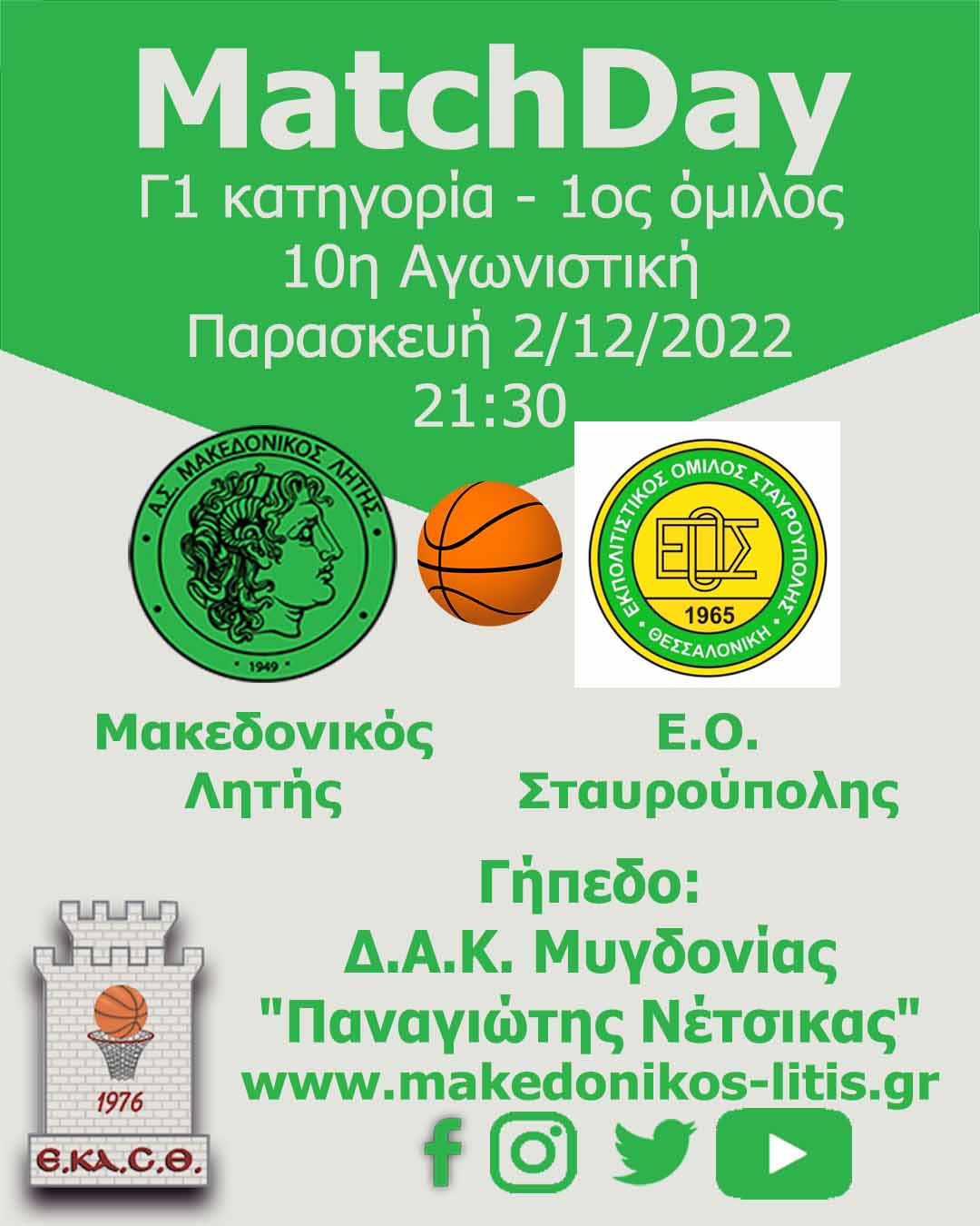 Μακεδονικός Λητής – Ε.Ο. Σταυρούπολης στην έδρα μας, με στόχο την τρίτη συνεχόμενη νίκη και πέμπτη συνολικά στο πρωτάθλημα.