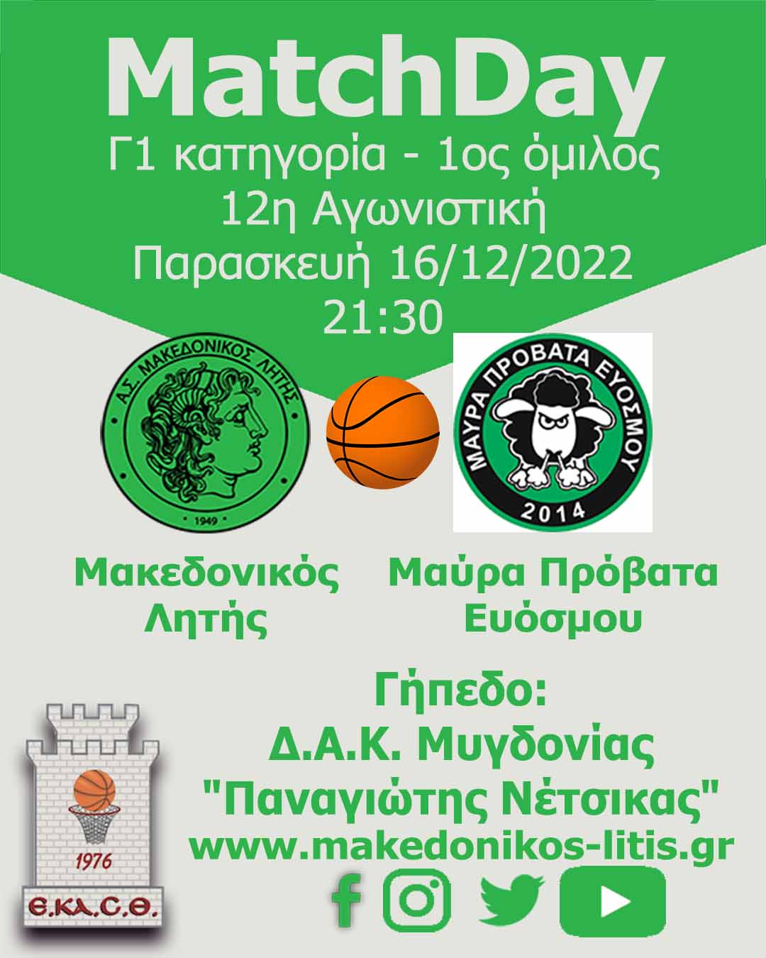 Σήμερα 16/12 και ώρα 21:30 φιλοξενεί τα Μαύρα Πρόβατα Εύοσμου στον τελευταίο αγώνα της χρονιάς.
