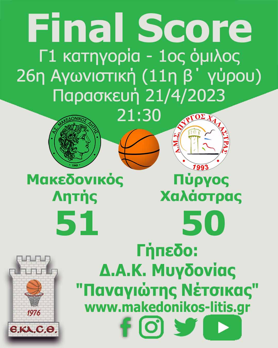 Μια μεγάλη νίκη πέτυχε ο Μακεδονικός Λητής για την 26η αγωνιστική του πρωταθλήματος, καθώς επικράτησε με σκορ 51-50 του Πύργου Χαλάστρας.