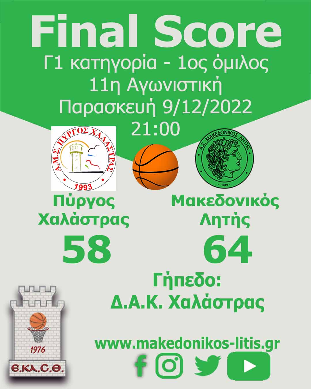 Σπουδαίο διπλό για τον Μακεδονικό Λητής στην δυνατή έδρα του Πύργου Χαλάστρας. Στον αγώνα της 11ης αγωνιστικής την Παρασκευή 9/12, η ο μάδα μας επικράτησε με σκορ 58-64.