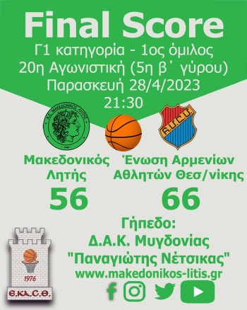 Ήττα για τον Μακεδονικό Λητής από την Αρμενική για τον εξ’ αναβολής αγώνα της 20ης αγωνιστικής με σκορ 56-66.