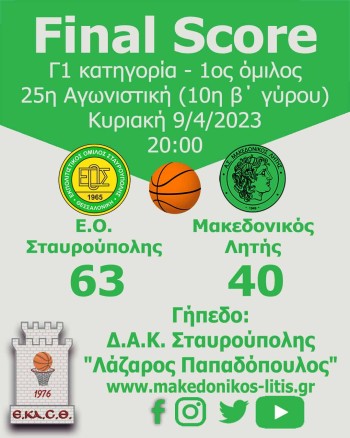 Ηττήθηκε η ομάδα μας από τον Ε.Ο. Σταυρούπολης την Κυριακή 9/4 για την 25η αγωνιστική του πρωταθλήματος με σκορ 63-40.
