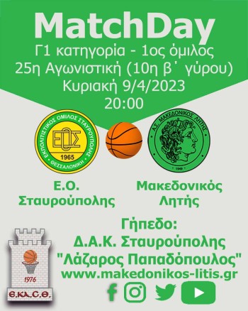 Με στόχο την νίκη ο Μακεδονικός Λητής αγωνίζεται εκτός έδρας σήμερα 9/4 και ώρα 20:00, καθώς φιλοξενείται στο Δ.Α.Κ. Σταυρούπολης "Λάζαρος Παπαδόπουλος" (Ηλιούπολη) από τον Ε.Ο. Σταυρούπολης για την 25η αγωνιστική του πρωταθλήματος.
