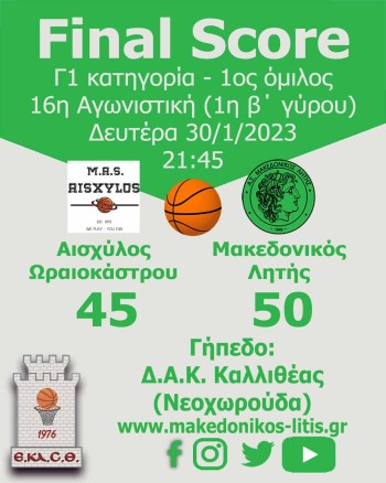 Νικηφόρο ήταν το πέρασμα του Μακεδονικού Λητής την Δευτέρα 30/1 από την έδρα του Αισχύλου Ωραιοκάστρου, τον οποίο και νίκησε με σκορ 45-50.
