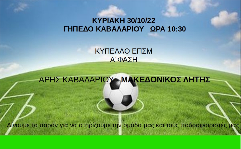 Τον Άρη Καβαλαρίου αντιμετωπίζει η ομάδα μας, αύριο Κυριακή 30/10 και ώρα 10:30, στο πλαίσιο της Α΄ φάσης του Κυπέλλου ΕΠΣΜ.