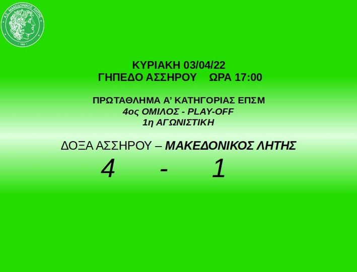 Την ήττα με σκορ 4-1 γνώρισε η ομάδα μας από την Δόξα Ασσήρου στην πρεμιέρα των αγώνων play off.