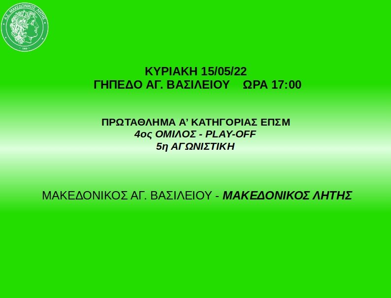Τον Μακεδονικό Αγίου Βασιλείου αντιμετωπίζει η ομάδα μας εκτός έδρας σήμερα Κυριακή 15/5 και ώρα 17:00, για την πέμπτη και προτελευταία αγωνιστική των play off.