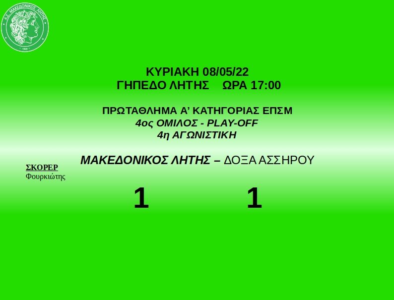 Με εναπομένουσες δύο αγωνιστικές για τα play off, ο Μακεδονικός Λητής έχει 9 βαθμούς στην προσπάθεια για κατάκτηση της δεύτερης θέσης, 4 μπροστά από τον Μακεδονικό Αγίου Βασιλείου, ο οποίος έχει 5 βαθμούς.