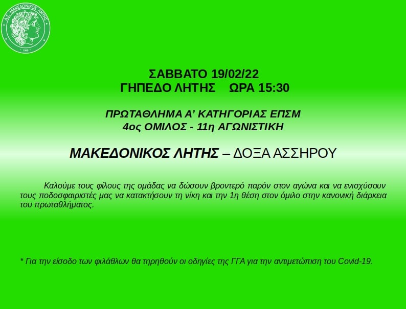 Ντέρμπι κορυφής το Σάββατο 19/2/2022 και ώρα 15:30 με τον Μακεδονικό Λητής να φιλοξενεί την πρωτοπόρο Δόξα Ασσήρου.