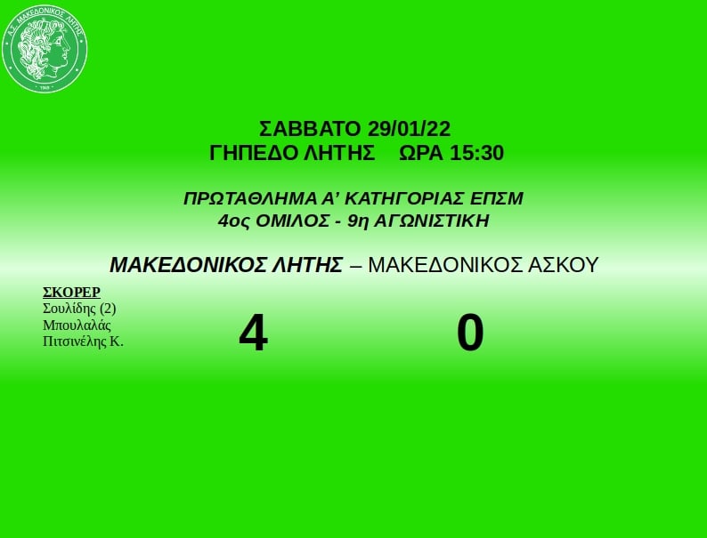 Με νίκη ξεκίνησε ο Μακεδονικός Λητής τις υποχρεώσεις του το 2022, καθώς επιβλήθηκε με σκορ 4-0 του Μακεδονικού Ασκού στο πλαίσιο της 9ης αγωνιστικής.