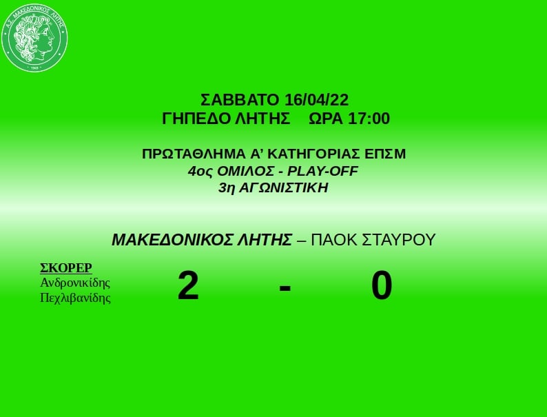 Με νίκη συνέχισε ο Μακεδονικός Λητής τις υποχρεώσεις του την τρίτη αγωνιστική των play off, καθώς επικράτησε με σκορ 2-0 εντός έδρας επί του ΠΑΟΚ Σταυρού.