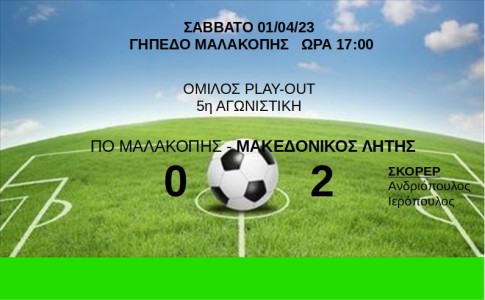 Πραγματοποιώντας την καλύτερη φετινή εμφάνισή της στα play-out, η ομάδα μας έκανε μεγάλο βήμα για την παραμονή της, κερδίζοντας με σκορ 0-2 τον ΠΟ Μαλακοπής, περνώντας για πρώτη φορά πάνω από τη γραμμή του υποβιβασμού και κρατώντας πλέον στα χέρια της την τύχη της παραμονής στην Α1.