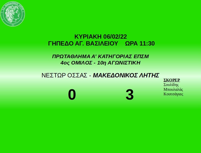 Άλλη μια νίκη για τον Μακεδονικό Λητής, καθώς επικράτησε εκτός έδρας με σκορ 0-3 επί του Νέστωρ Όσσας για την 10η αγωνιστική του πρωταθλήματος.