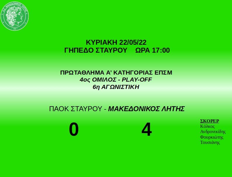 Νικηφόρα ολοκλήρωσε τις υποχρεώσεις του στα play off ο Μακεδονικός Λητής, καθώς επικράτησε με σκορ 0-4 εκτός έδρας επί του ΠΑΟΚ Σταυρού. Η ομάδα μας ήδη έχει καταλάβει την δεύτερη θέση που οδηγεί σε αγώνα μπαράζ για την άνοδο στην Α1 κατηγορία.