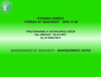 Τον Μακεδονικό Αγίου Βασιλείου αντιμετωπίζει η ομάδα μας εκτός έδρας σήμερα Κυριακή 15/5 και ώρα 17:00, για την πέμπτη και προτελευταία αγωνιστική των play off.
