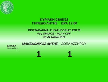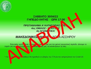 Η Ε.Π.Σ.Μ. ανακοίνωσε ότι αναβάλλεται ο αγώνας του 4ου ομίλου της Α’ κατηγορίας Μακεδονικός Λητής – Δόξα Ασσήρου που ήταν προγραμματισμένος να διεξαχθεί το Σάββατο 30 Απριλίου 2022 και ώρα 17.00 στο γήπεδο Λητής, επειδή επιβεβαιώθηκαν θετικοί στο covid – 19 ποδοσφαιριστές της φιλοξενούμενης ομάδας. Ο αγώνας θα επανοριστεί να πραγματοποιηθεί την Κυριακή 8 Μαϊου 2022 και ώρα 17.00 στο γήπεδο Λητής.