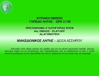 Την Δόξα Ασσήρου υποδέχεται ο Μακεδονικός Λητής την Κυριακή 8/5 και ώρα 17:00, στον εξ' αναβολής αγώνα για τέταρτη αγωνιστική των play off.